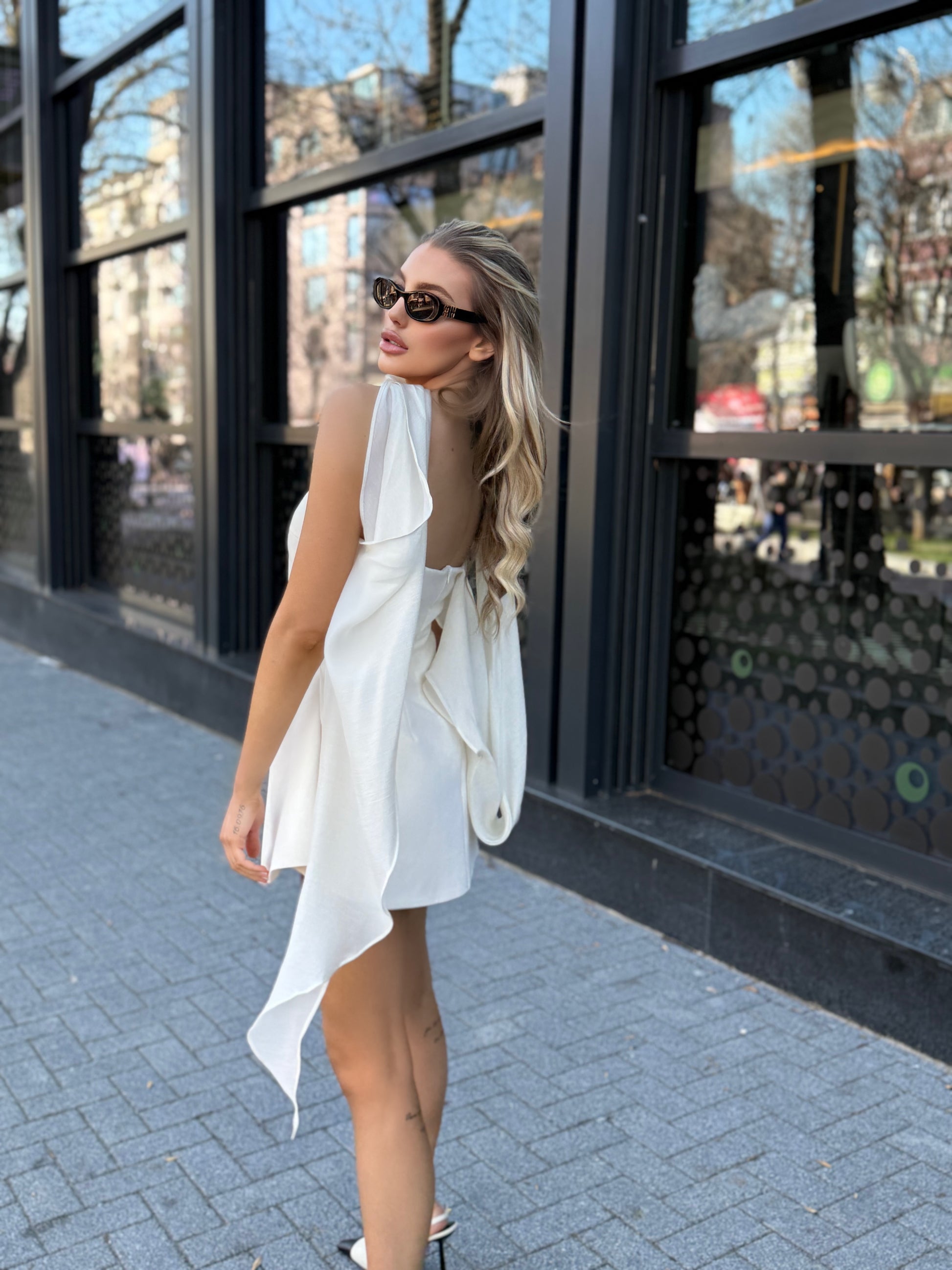 Къса разкроена рокля в бяло